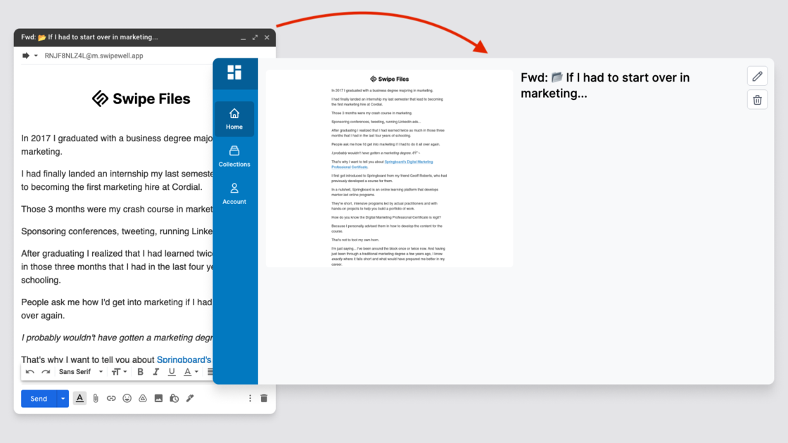 A unique forwardable address makes it super easy to swipe emails straight from your inbox.
